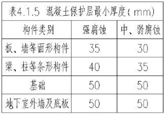 5)在腐蝕環(huán)境下,全部鋼筋(縱筋、箍筋、分布筋等)的混凝土保護(hù)層最小厚度,應(yīng)符合表4.1.5的規(guī)定。