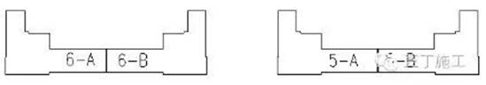根據(jù)設(shè)計(jì)后澆帶及伸縮縫的設(shè)置,將地下室墻柱及頂板梁劃分為4個(gè)區(qū)域分別進(jìn)行混凝土的澆筑及試塊的留置,4個(gè)區(qū)域包括5-A、5-B、6-A、6-B,如下圖所示: