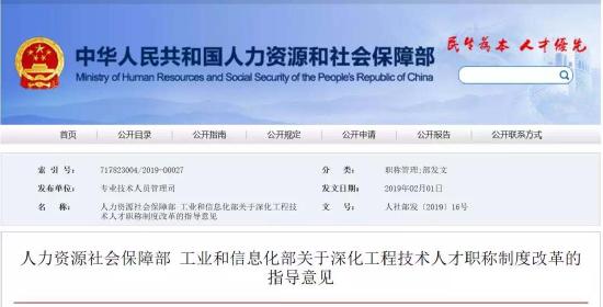 2019年2月1日,人力資源社會(huì)保障部官網(wǎng)發(fā)布《關(guān)于深化工程技術(shù)人才職稱制度改革的指導(dǎo)意見(jiàn)》,意見(jiàn)提出: