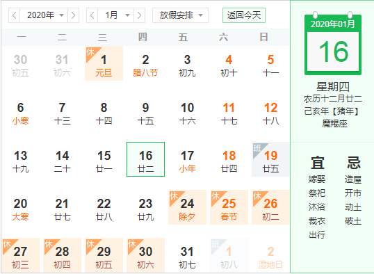 1月24日至30日放假調(diào)休,共7天。1月19日(星期日)、2月1日(星期六)上班。