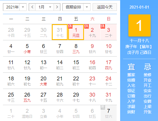2021年1月1日至2021年1月3日放假,共3天。